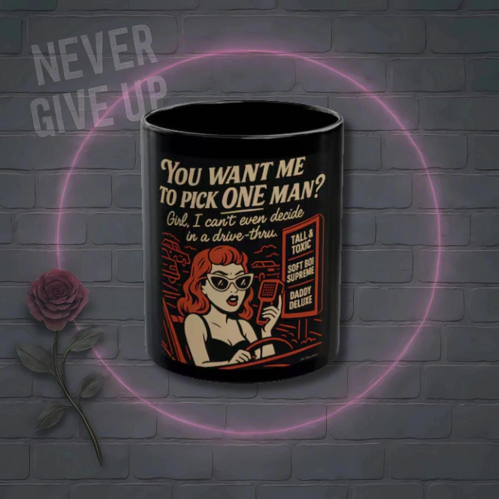 Start your day with a laugh (and a strong cup of coffee!) with this hilarious "You Want Me To Pick One Man? Girl, I Can't Even Decide In A Drive-Thru." Coffee Mug. Perfect for anyone who finds humor in the everyday struggles of choice, whether it's men or menu items!